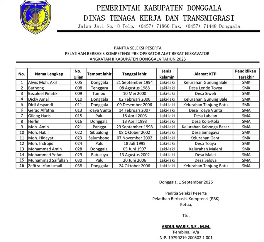 Donggala, Teraskabar.id – Sebanyak 16 warga Donggala dinyatakan lolos seleksi Pelatihan Berbasis Kompetensi (PBK) Operator Track Excavator, yang digelar oleh Dinas Tenaga Kerja dan Transmigrasi Kabupaten Donggala