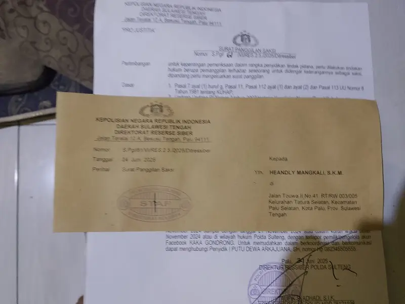Palu, Teraskabar.id – Wartawan Hendly Mangkali kembali diperiksa Direktorat Reserse Siber (Ditseber) Polda Sulteng, sebagai saksi dalam kasus dugaan pelanggaran Undang-Undang ITE yang dilaporkan Istri Bupati Morowali Utara (Morut).