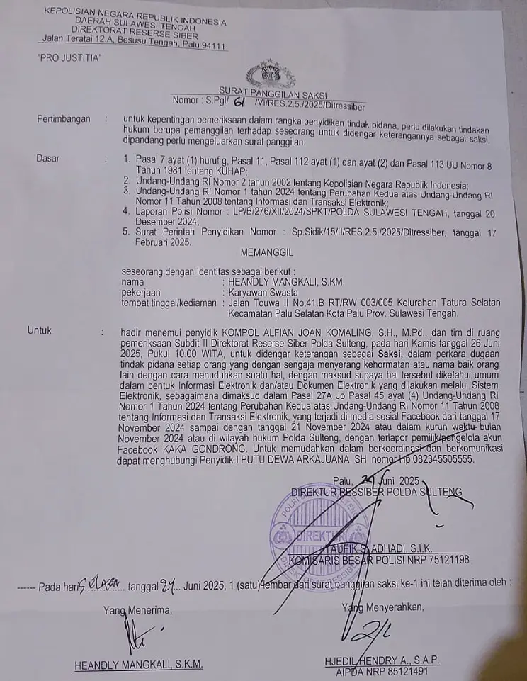 Hendly Mangkali, wartawan berambut gondrong ini menghadiri panggilan penyidik pada Kamis (26/6/2025) pukul 09.58 Wita. Ia mengaku dicecar pertanyaan seputar produk jurnalistik yaitu berita yang ditulis dalam portal media Beritamorut.id dan diposting di akun sosial media Kaka Gondrong, yang kemudian berubah nama menjadi Hendly Mangkali.